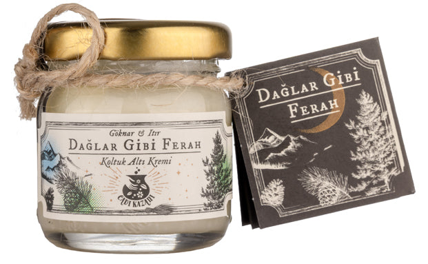 Itır, biberiye ve çam yağları, zeytinyağı, hindistancevizi yağı, balmumu, karbonat ve diğer bitki bazlı içeriklerle harmanlanmış koltuk altı kremi.