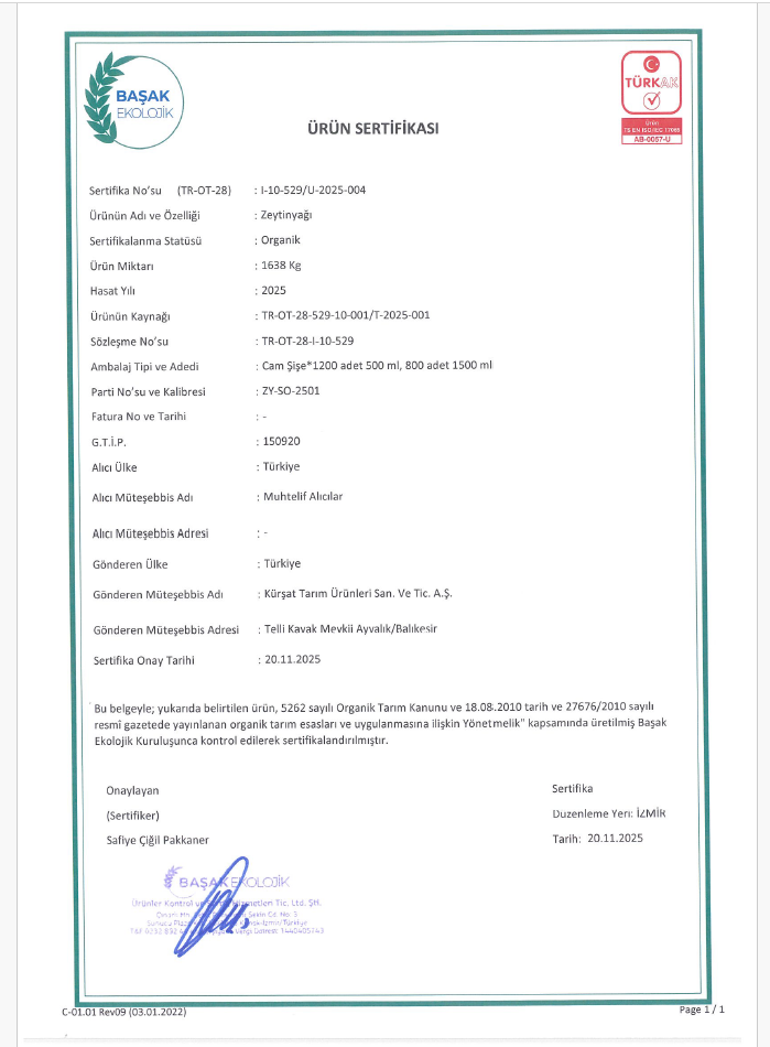 Ayvalık’ta, Organik Tarım uygulamaları yürüttüğümüz bahçelerimizin, 2025 / 2026 mahsulü. Meyvenin erken hasata en uygun olan döneminde el ile darbe görmeden hasat ettik ve gün içerisinde Soğuk Sıkım (Cold Press) olarak ürettik. Oleik asit cinsinden serbest asitlik değeri; 0,8% Max.