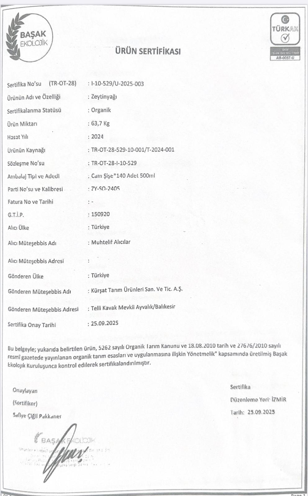 Ayvalık’ta, Organik Tarım uygulamaları yürüttüğümüz bahçelerimizin, 2024 / 2025 mahsulü. Meyvenin erken hasata en uygun olan döneminde el ile darbe görmeden hasat ettik ve gün içerisinde Soğuk Sıkım (Cold Press) olarak ürettik. Oleik asit cinsinden serbest asitlik değeri; 0,8% Max.